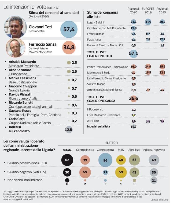 Secondo il sondaggio realizzato da Ipsos tra il 28 settembre e l’1 agosto, Giovanni Toti sarebbe in netto vantaggio su Ferruccio Sansa. Nel dettaglio, il candidato del centrodestra, sostenuto da Lega, Fratelli d’Italia, Cambiamo e moderati (Forza Italia, Polis, Liguria Popolare) sarebbe al 57,4%, oltre 20 punti in più del candidato del centrosinistra, sostenuto da Pd, M5S, Lista Ferruccio Sansa, Sinistra Italiana e Europa Verde-Demos), fermo al 34,8%.