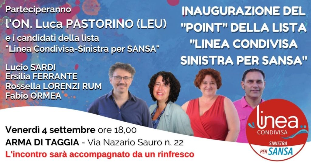 Venerdì 4 settembre alle 18 ad Arma di Taggia, in via N. Sauro 22, verrà inaugurato il “Point” della Lista “Linea Condivisa-Sinistra per Sansa” con l’on. Luca Pastorino (LEU).