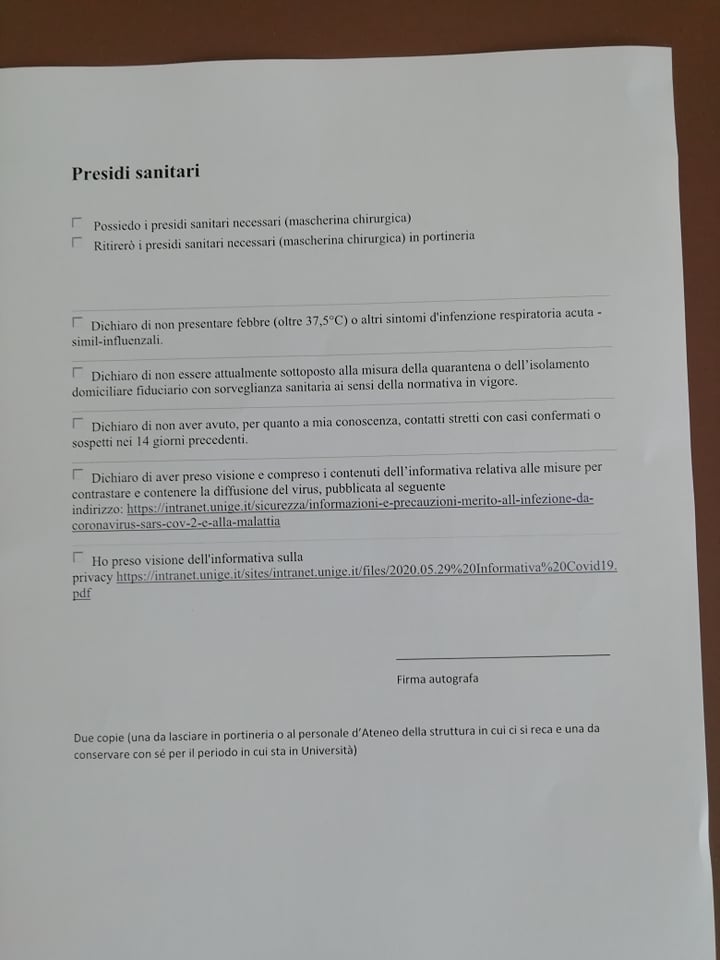 Per accedere al polo universitario imperiese, gli studenti dovranno compilare un modulo disponibile online, con il quale autocertificheranno di non avere la febbre, di non essere sottoposti a quarantena e di non essere entrati in contatto con persone contagiate nei 14 giorni antecedenti il loro accesso in Ateneo.
