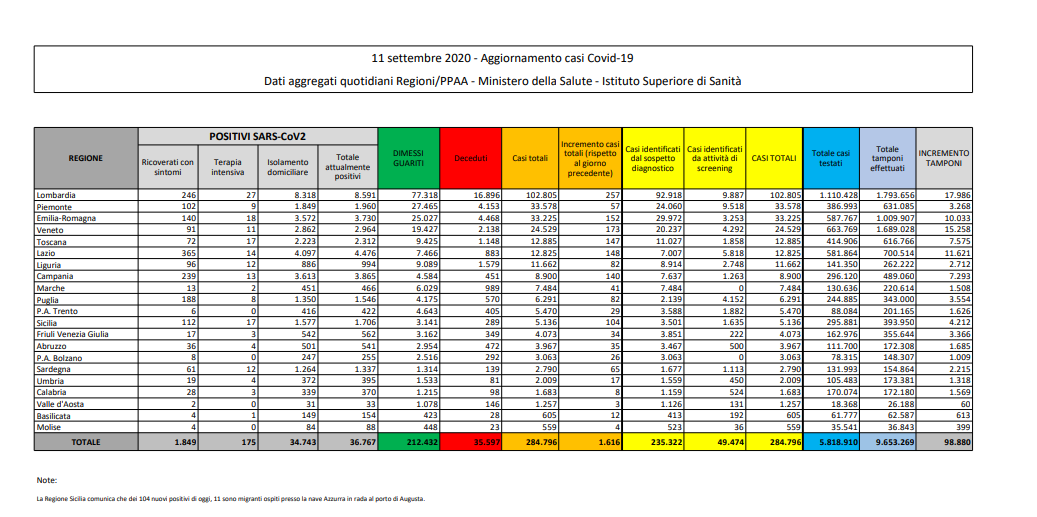 Coronavirus, Italia: il bollettino di giovedì 10 settembre