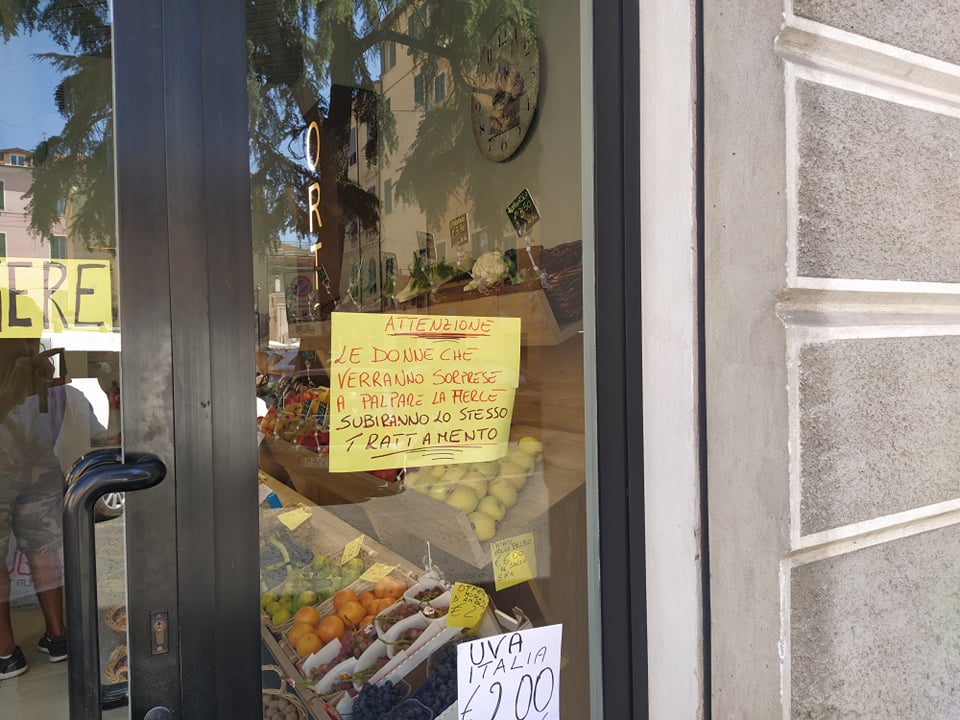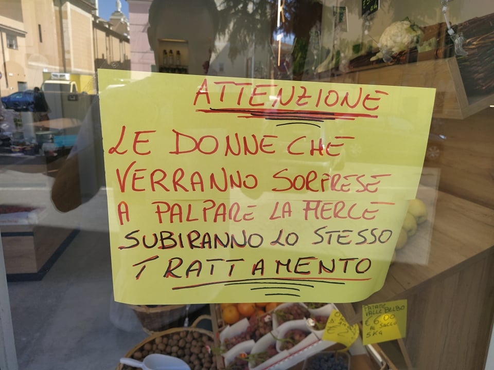 “Attenzione. Le donne che verranno sorprese a palpare la merce subiranno lo stesso trattamento”. Il cartello, che sta già molto facendo discutere in città, tanto che sono pervenute svariate segnalazioni al nostro giornale, è comparso sulla vetrina di un negozio di frutta e verdura di Piazza Goito.