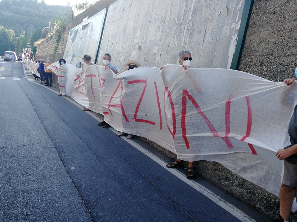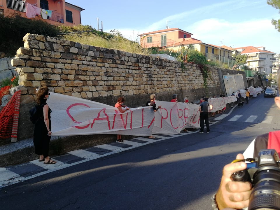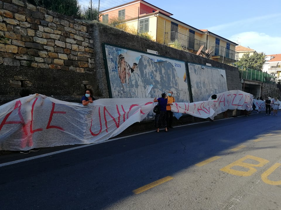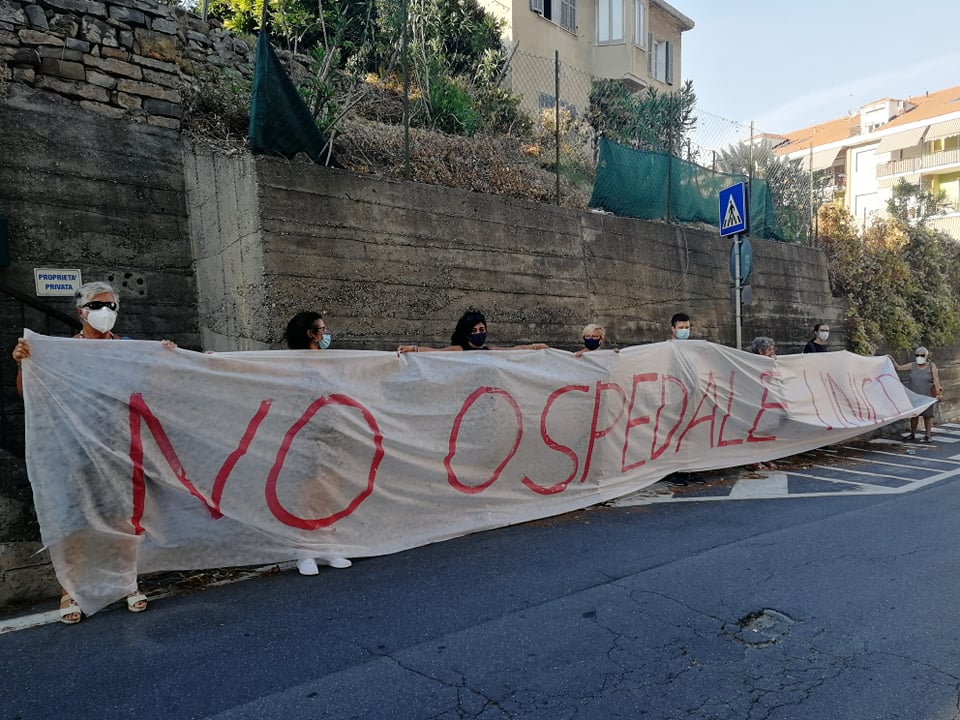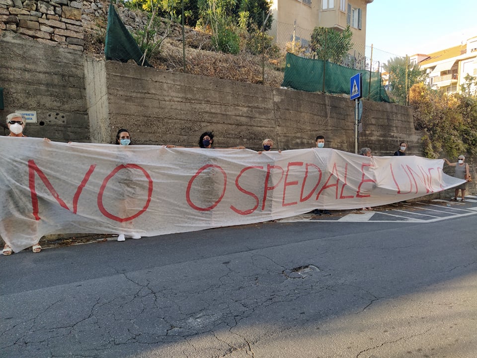 I presenti, circa 40 attivisti, hanno esposto grandi striscioni per una lunghezza di 80 metri rimarcando la propria contrarietà sul progetto dell’Ospedale Unico di Taggia. “No Ospedale Unico, no alle privatizzazioni”, si legge sugli striscioni.