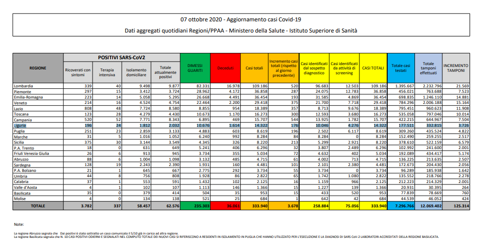 Coronavirus, Italia: il bollettino di mercoledì 7 ottobre