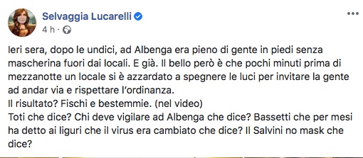 Nel dettaglio, come raccontato dalla Lucarelli nel post sul suo profilo Facebook, corredato da foto e video, verso mezzanotte di ieri sera un locale di Albenga ha spento le luci per invitare gli avventori ad allontanarsi per rispettare le misure restrittive recentemente disposte dal Governo per contrastare l’aumento dei contagi. In risposta, però, i titolari hanno ricevuto fischi, urla e bestemmie.