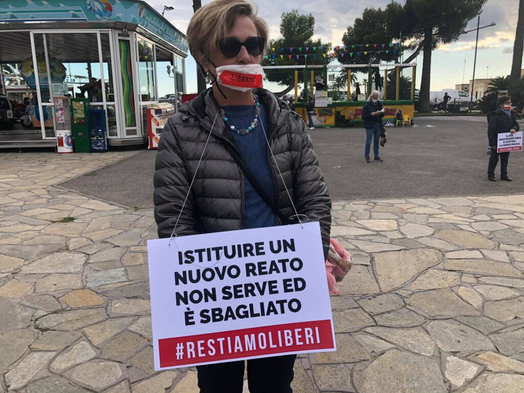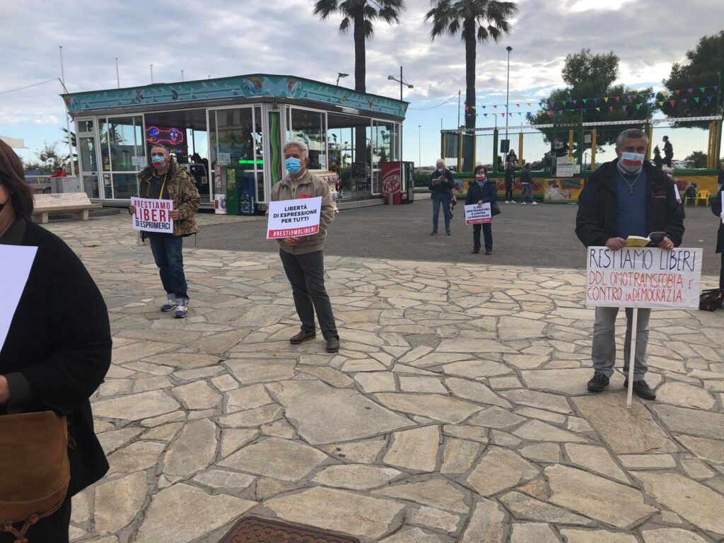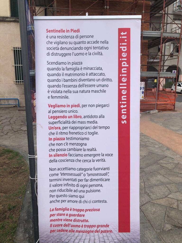 In totale 100 le piazze, nelle principali città d’Italia, che hanno aderito all’iniziativa promossa dalla Sentinelle in Piedi. Ieri, a Imperia, circa 30 gli attivisti in Spianata Borgo Peri, molti dei quali con cartelli. “La famiglia non è un reato di opinione”, “Restiamo liberi di educare”, “Il Legislatore rispetti la Costituzione”, “DDL Omotransfobia è contro la democrazia”, “No alla legge Liberticida”.