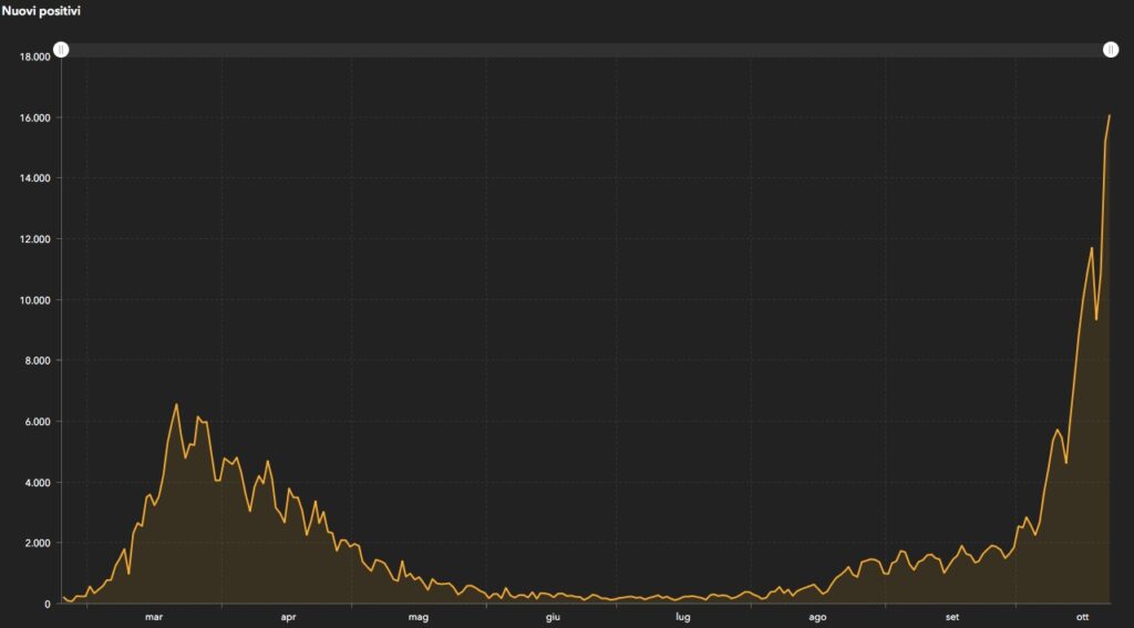 Aumenta ancora il numero di nuovi casi di Coronavirus in Italia. Nelle ultime 24 ore se ne sono registrati 16.079 (ieri 15.199), a fronte di un aumento dei tamponi effettuati, 170.392 (ieri 144.737).