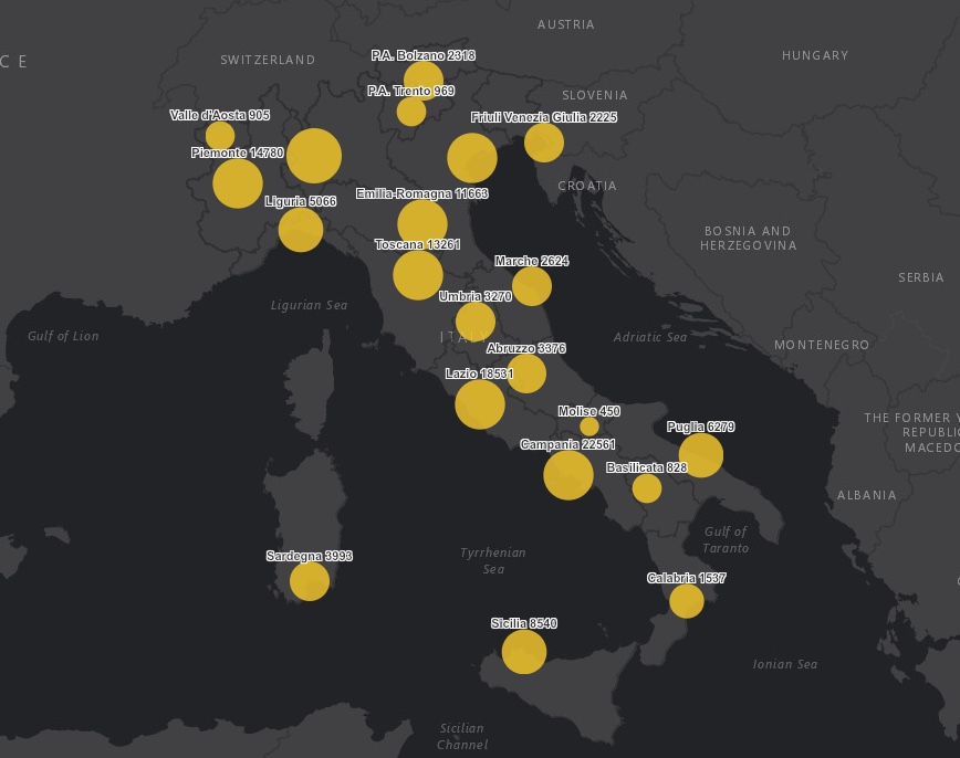 Tutte le regioni di Italia hanno fatto registrare almeno un nuovo caso di Coronavirus nelle ultime 24 ore. Il Molise risulta essere la meno regione meno colpita (+28).