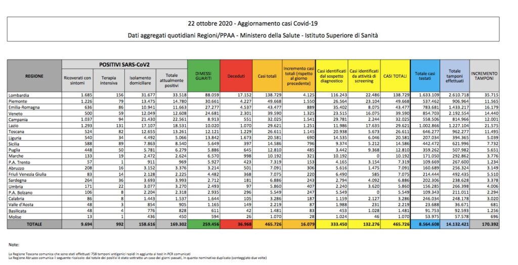 Coronavirus, Italia: il bollettino di giovedì 22 ottobre