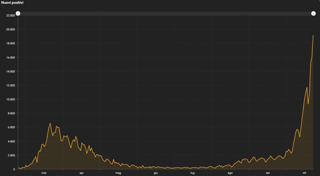 Aumenta ancora il numero di nuovi casi di Coronavirus in Italia. Nelle ultime 24 ore se ne sono registrati 19.143 (ieri 16.079 ), a fronte di un aumento dei tamponi effettuati, 182.032 (ieri 170.392).