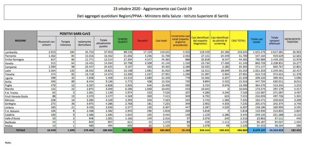 Coronavirus, Italia: il bollettino di venerdì 23 ottobre