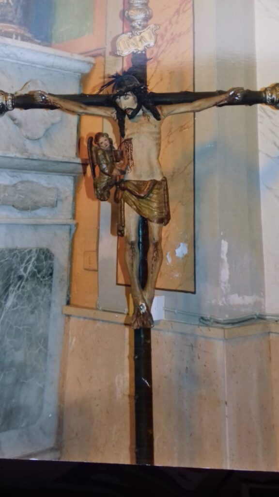 Per ultima, l‘opera più antica della chiesa, il crocefisso processionale quattrocentesco da confraternita, detto l’Albero della Vita. Le parti in legno sono prese da tronco di albero, si dice di limoni, trattato appositamente per crescere dritto. Il Cristo è molto particolare. È una versione, una delle poche esistenti, in cui c’è un angioletto vicino al costato che raccoglie il sangue di Gesù nel calice.