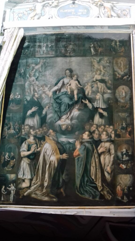Secondo le testimonianze, Van Dyck e Paolina avrebbero superato il ruscello entrando nel territorio dei Savoia, dove il marito di Paolina non poteva più seguirli e vendicarsi. Durante quel periodo, Van Dyck avrebbe quindi ha dipinto per la chiesa questo dipinto bellissimo in cui è rappresentata la Madonna con il viso della donna amata. Inoltre, c’è anche un angelo con il viso del Van Dyck all’epoca. Il quadro negli anni 80 è stato rubato e ritrovato a Sarzana tramite una lettera anonima. Ha fatto parte della collezione di Van Dyck presentata a Genova negli anni 90, ed è stato il quadro più ammirato della mostra per la bellezza dei colori e bellezza del viso.