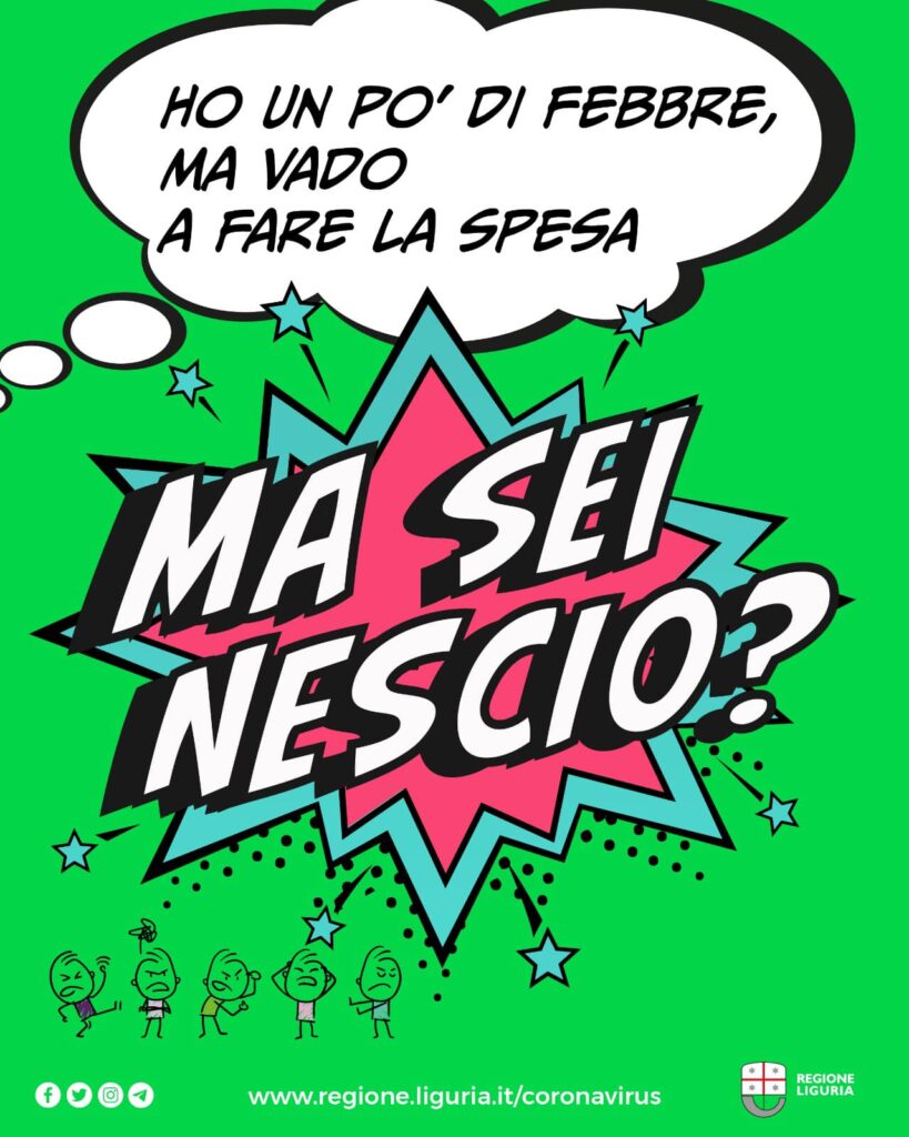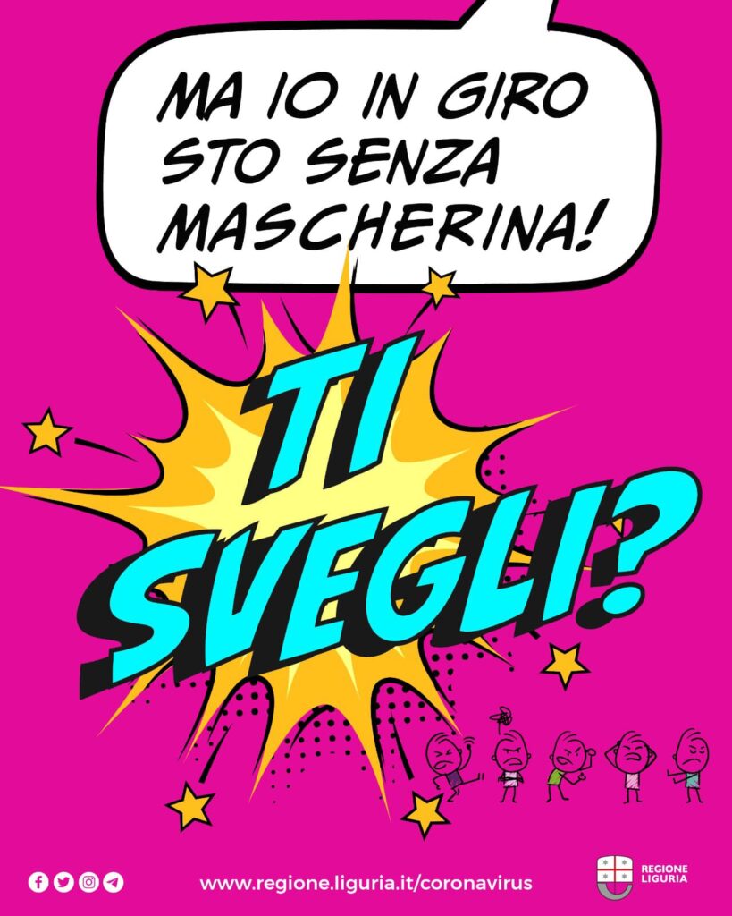 Da oggi sarà visibile sui canali social di Regione Liguria la nuova campagna di sensibilizzazione al rispetto delle norme di contenimento Covid. Protagonisti dell’iniziativa sono illustrazioni pop, dai colori accesi tipici dei fumetti e ironici scambi di battute, anche in dialetto, che invitano i cittadini, soprattutto i più giovani, a utilizzare la mascherina, rispettare il distanziamento sociale, curare l’igiene delle mani e avere responsabilità nei comportamenti individuali.