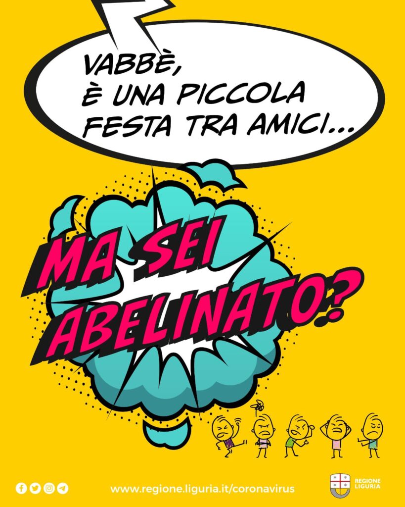 “Ho mal di gola, ma vado lo stesso a trovare la nonna” “Ma sei nescio?”, “Almeno con gli amici niente mascherina” “Ma sei fuori?”, “Vabbè, è una piccola festa tra amici..” “Ma sei abelinato?” queste e altre le frasi ad effetto scelte da Regione per attirare l’attenzione degli utenti social e invitarli ad assumere comportamenti giudiziosi, per sé e per gli altri.
