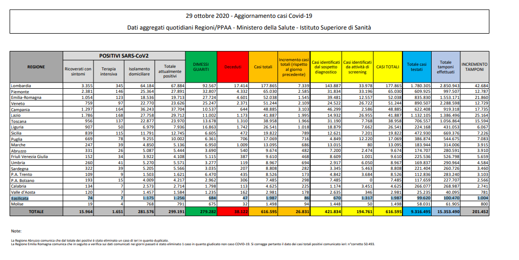 Coronavirus, Italia: il bollettino del 29 ottobre