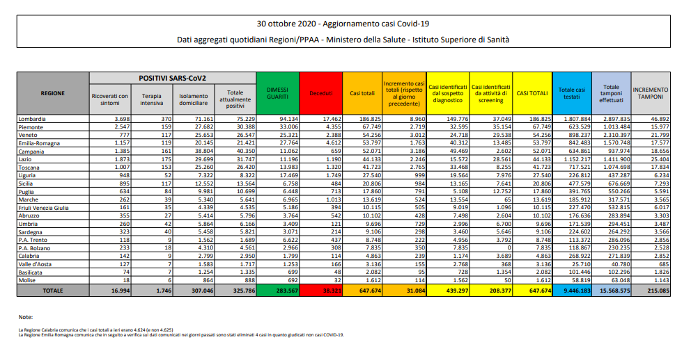 Coronavirus, Italia: il bollettino del 30 ottobre
