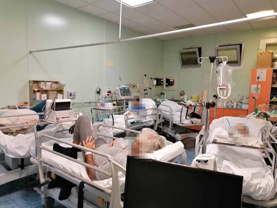 Tre medici che si muovono scavalcando letti e persone, cercando di tenere d’occhio decine e decine di schermi con i parametri vitali che pulsano nei led verdi dei monitor sistemati come si può: ossigeno, pulsazioni.