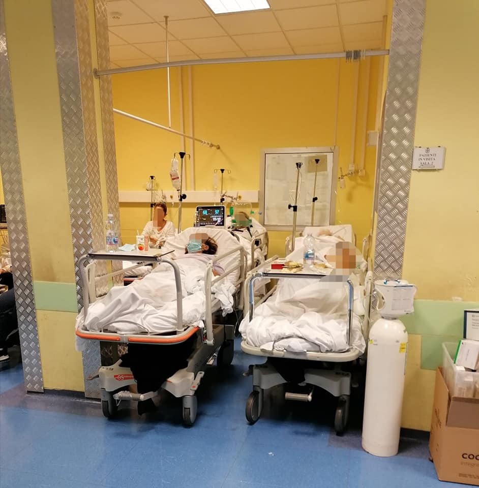 Manca il personale e manca lo spazio. ‘Capita spesso che dobbiamo visitare le persone direttamente a bordo delle ambulanze perché non sappiamo dove sistemarle!’, ti senti raccontare. Mancano anche le barelle: ‘Mi hanno preso la barella e ci hanno sistemato un malato perché non sapevano dove metterlo. Ma io da ore aspetto e non posso andarmene’, spiega un milite della Croce che attende nel parcheggio per andarsene con l’ambulanza.