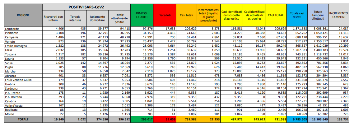 Tutte le regioni di Italia hanno fatto registrare almeno un nuovo caso di Coronavirus nelle ultime 24 ore. Il Molise risulta essere la meno colpita (+101).