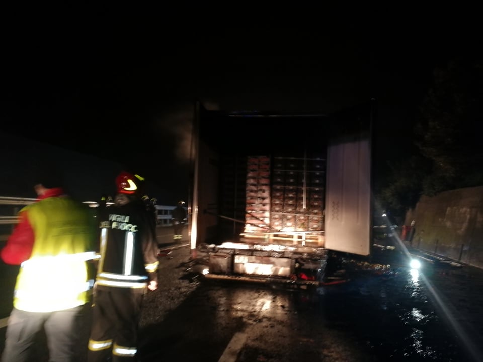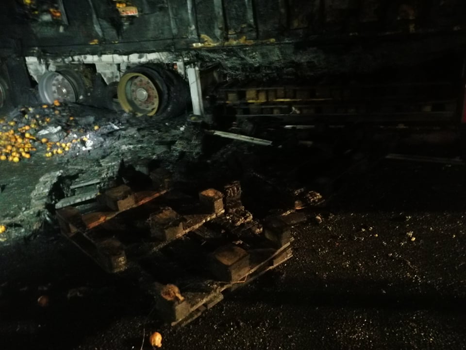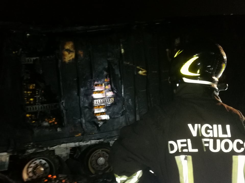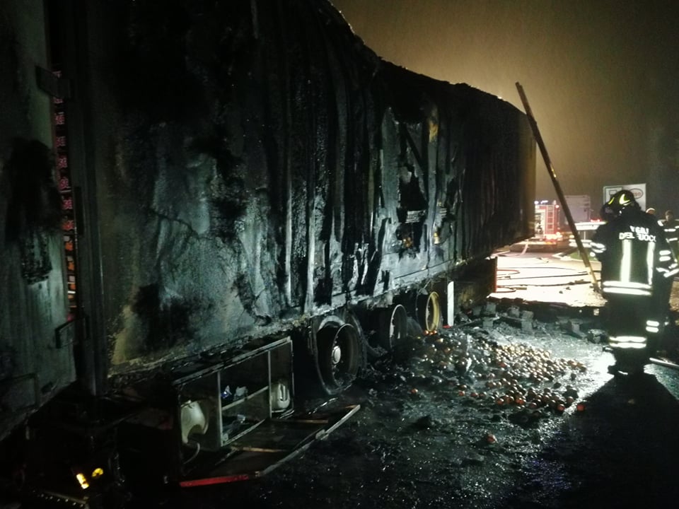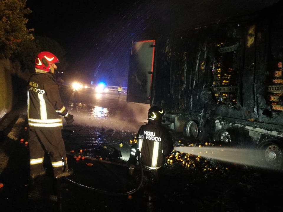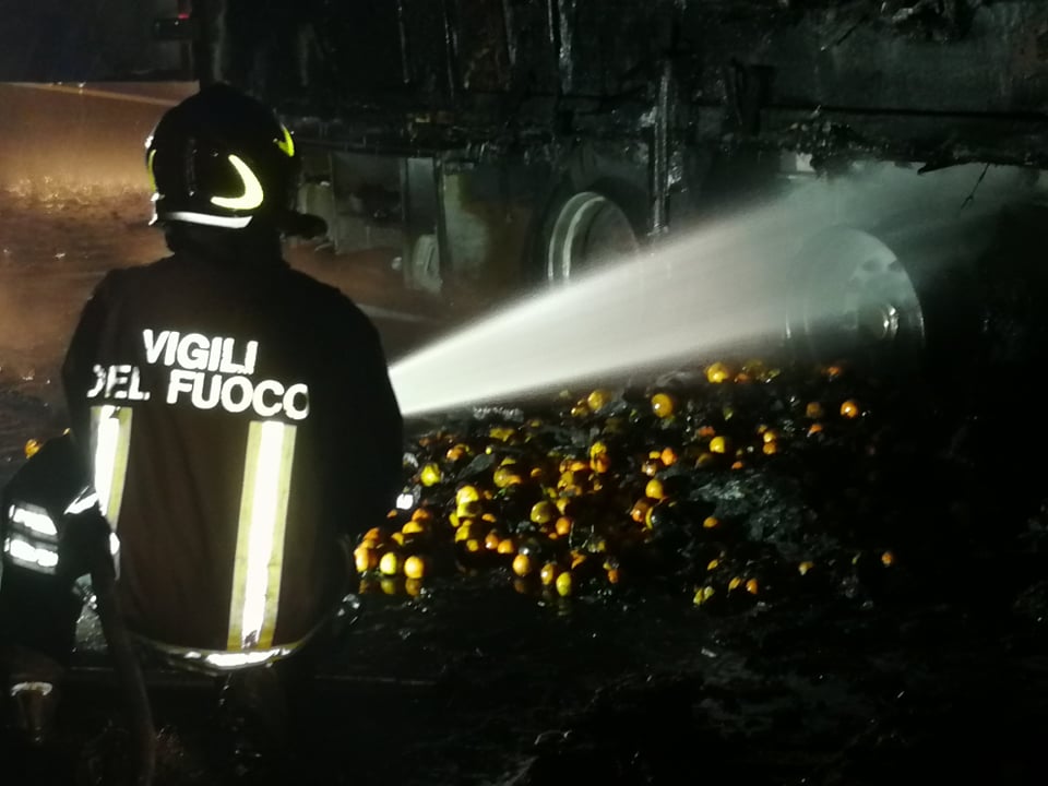 Successivamente sono intervenuti i Vigili del Fuoco, con più squadre, che sono riusciti ad avere ragione delle fiamme in poco meno di un’ora. La motrice non ha subito danni, mentre il rimorchio frigo, con un carico di arance, è andato distrutto.