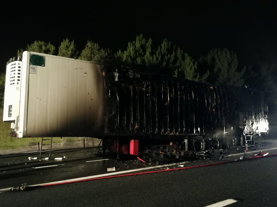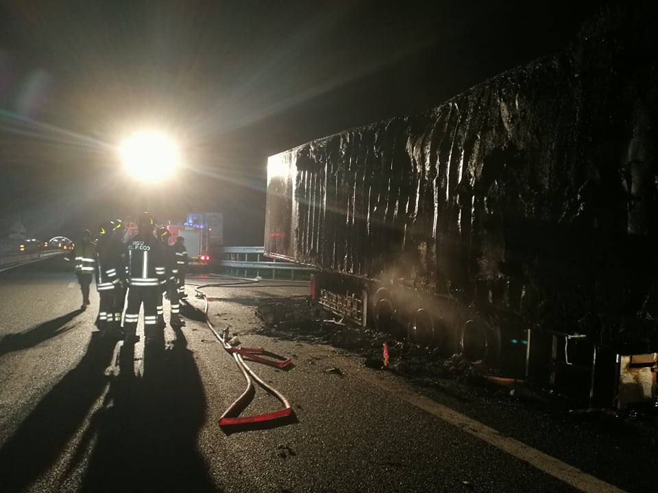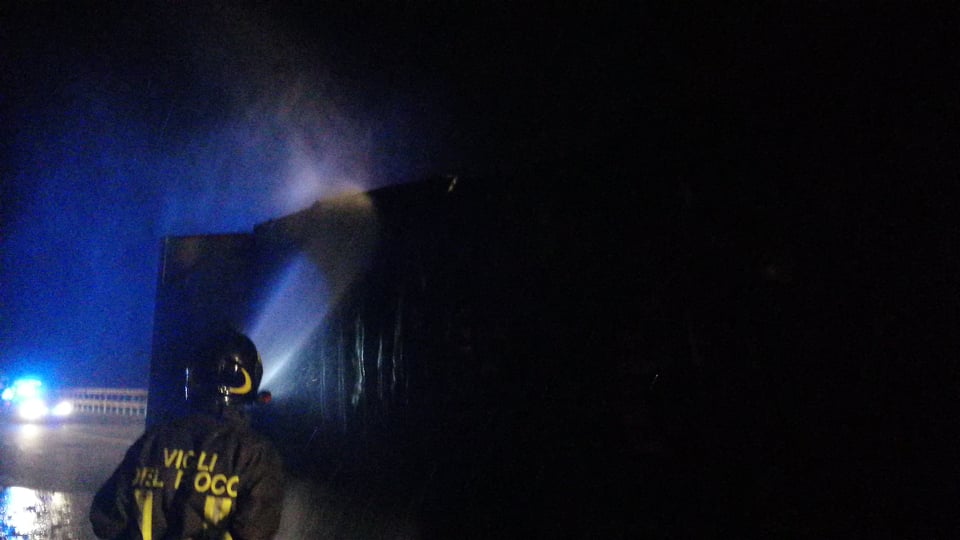 Il Tir, proveniente dalla Spagna, per cause ancora in fase di accertamento, forse per un guasto, ha preso fuoco. Il conducente è riuscito a mettersi in salvo prima che le fiamme avvolgessero il mezzo pesante e a lanciare l’allarme.