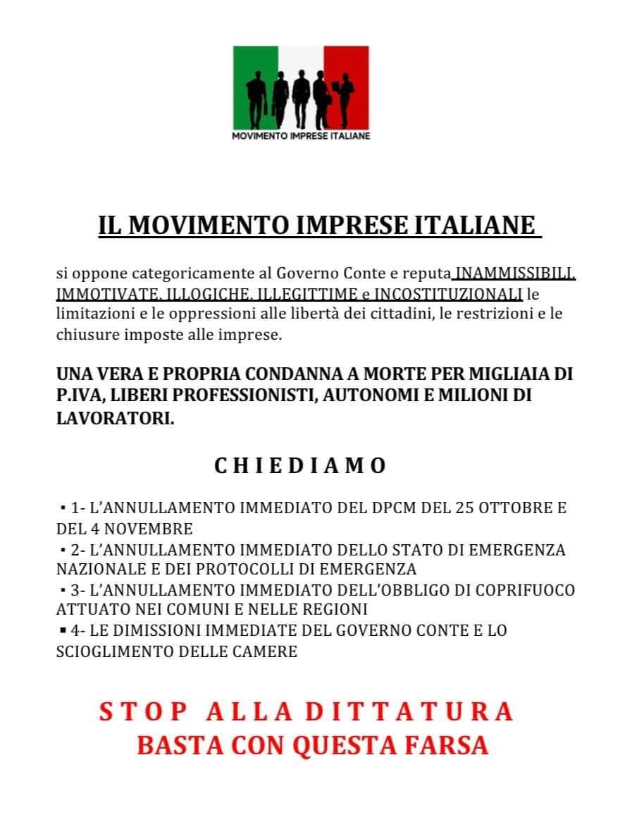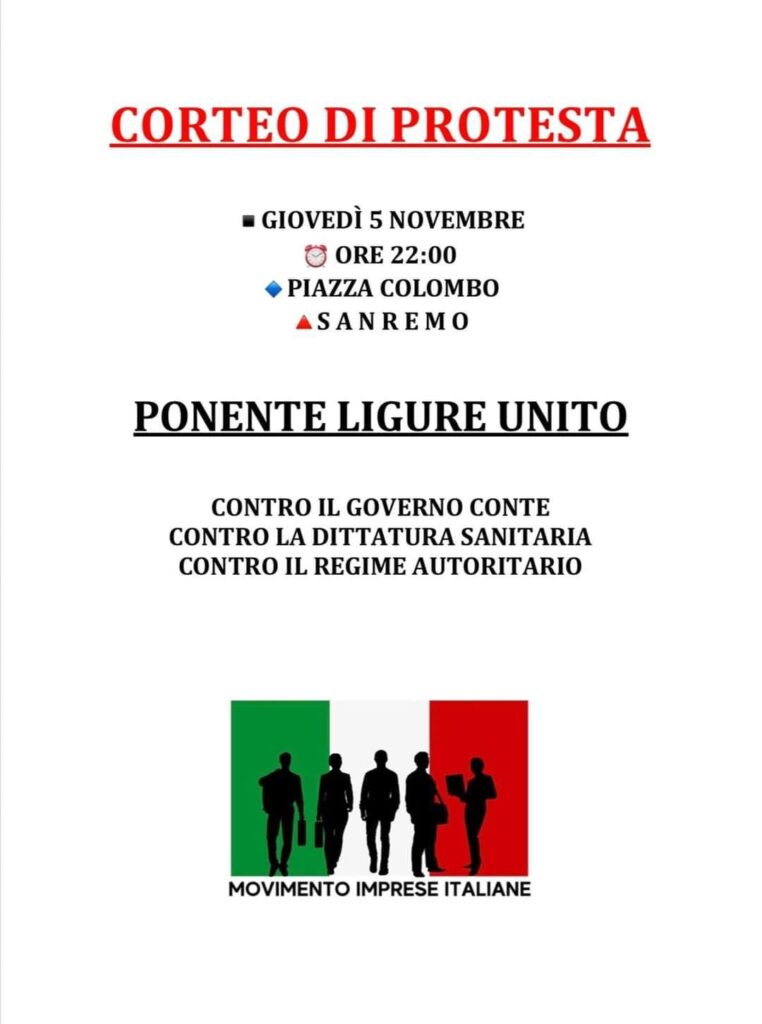 “Con il seguente comunicato, il direttivo del Movimento Imprese Italiane intende rivolgere l’invito a tutto il ponente ligure, ad unirsi e partecipare ad un corteo di pacifica protesta contro i DPCM del 25 Ottobre e del 4 Novembre 2020 emanati dal Governo Conte, che limitano e opprimono in maniera ingiustificata le libertà dei cittadini, imponendo restrizioni e chiusure forzate alle attività commerciali. L’appuntamento sarà per tutti in piazza Colombo, Giovedì 5 novembre alle ore 22:00.