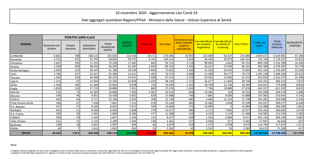 Coronavirus, Italia: il bollettino di martedì 10 novembre