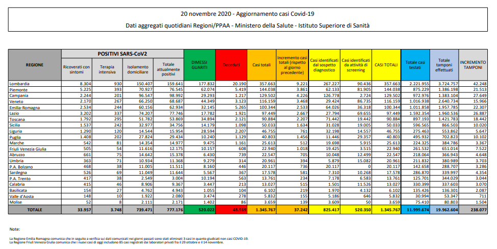 Coronavirus, Italia: il bollettino di venerdì 20 novembre