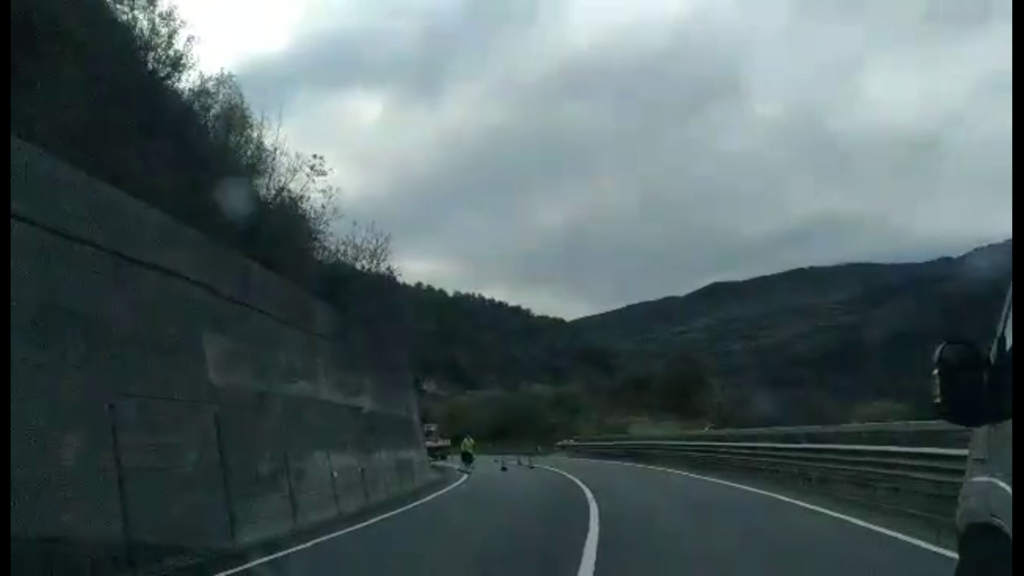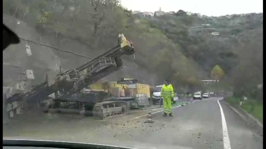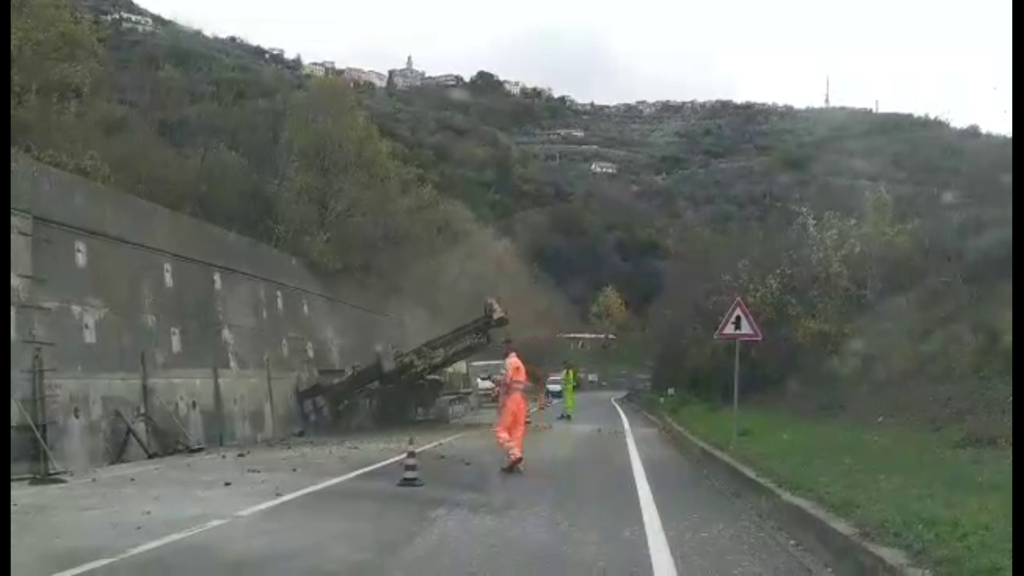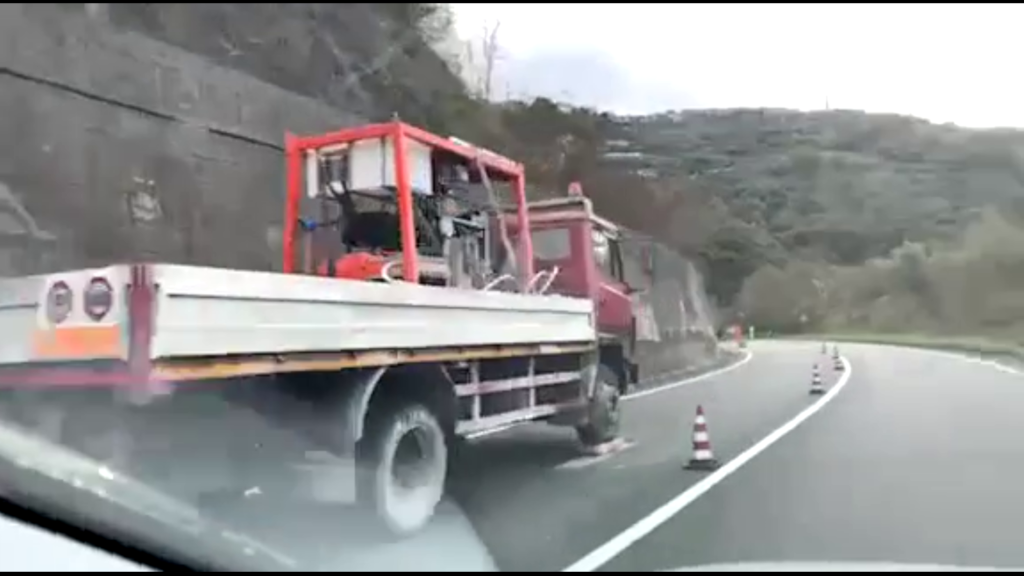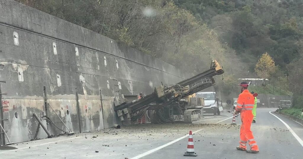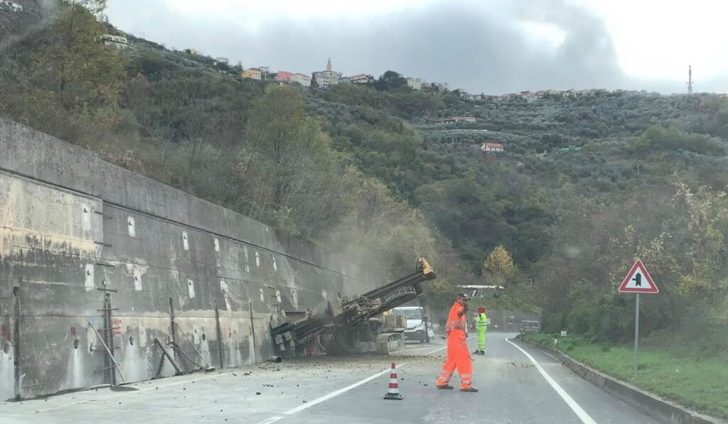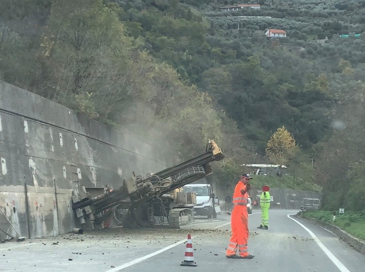 Un’impresa specializza, incaricata da Anas, sta eseguendo una palificazione orizzontale dell’alto muro di contenimento, in cemento armato, che si trova a bordo strada. Nel corso dell’ultima alluvione, da quello stesso muro erano colati fango e detriti che si erano riversati sulla strada statale ed evidentemente successivi controlli hanno fatto ritenere necessario un consolidamento della struttura.