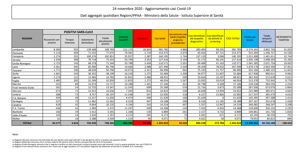 Coronavirus, Italia: il bollettino di martedì 24 novembre