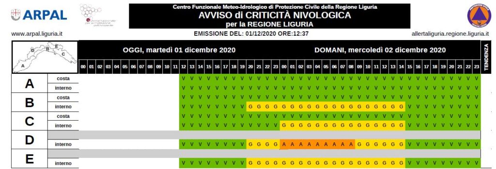 DOMANI MERCOLEDÌ 2 DICEMBRE: nella prime ore neve moderata a tutte le quote su D, moderata fino a bassa quota su E e interno di BC (300-400 m), debole fino a quote collinari su levante di A. Non si escludono temporanei sconfinamenti con fiocchi o neve mista a pioggia nei comuni costieri su parte ovest di B. Dal pomeriggio attenuazione dei fenomeni con miglioramento in serata. Venti settentrionali di burrasca su ABC, forti su DE. Sensibile calo termico con disagio fisiologico per freddo anche lungo la costa. Mare localmente agitato al largo, stirato sotto costa.