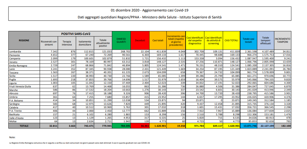 Coronavirus, Italia: il bollettino di domenica 1 dicembre