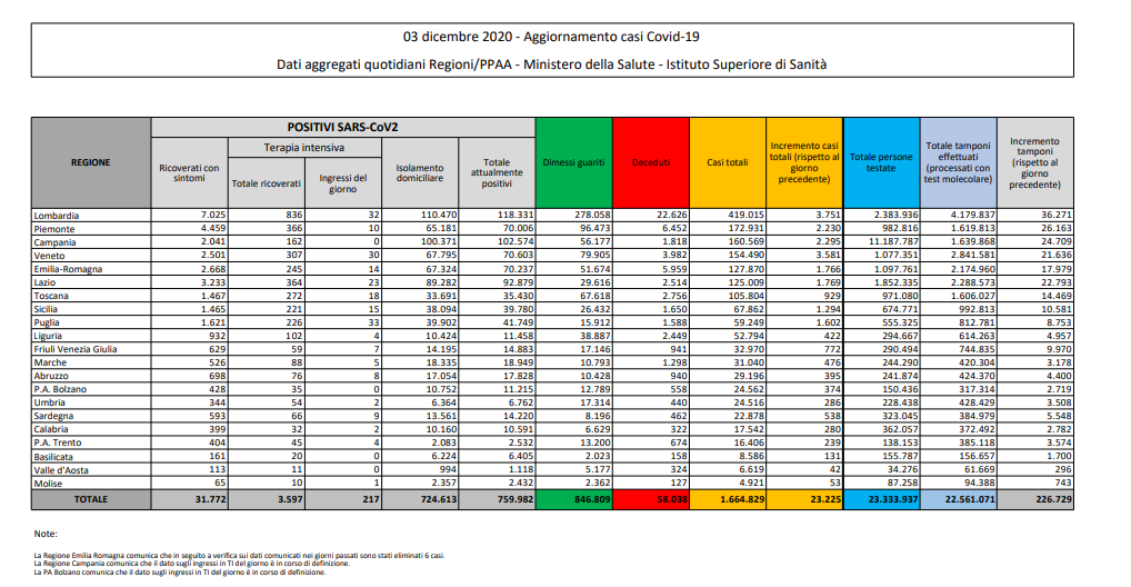 Coronavirus, Italia: il bollettino di giovedì 3 dicembre