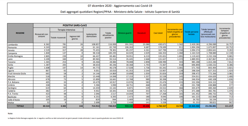 Coronavirus, Italia: il bollettino di lunedì 7 dicembre
