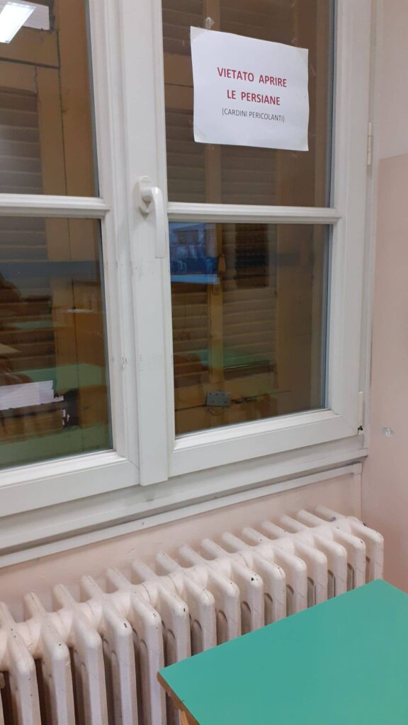 Inoltre, per il covid vengono lasciate aperte le porte di emergenza, con la conseguente formazione di correnti d’aria per i corridoi e dentro le aule. In aggiunta, in una classe le persiane non si possono aprire perché ci sono cardini pericolanti, quindi niente luce solare.