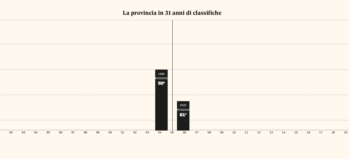 Al primo posto si posiziona Bologna, mentre Imperia (che perde 31 posizioni rispetto al 1990) risulta l’ultima anche tra le province liguri. Genova, infatti, è al 22° posto, La Spezia al 45° e Savona al 48°.