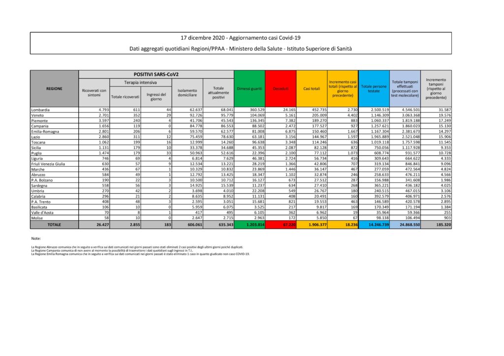 Coronavirus, Italia: il bollettino di giovedì 17 dicembre
