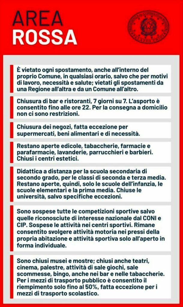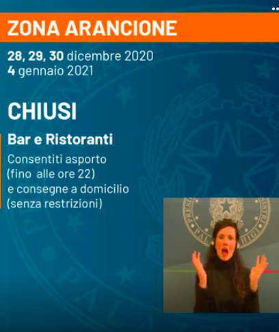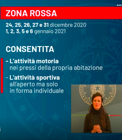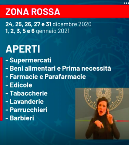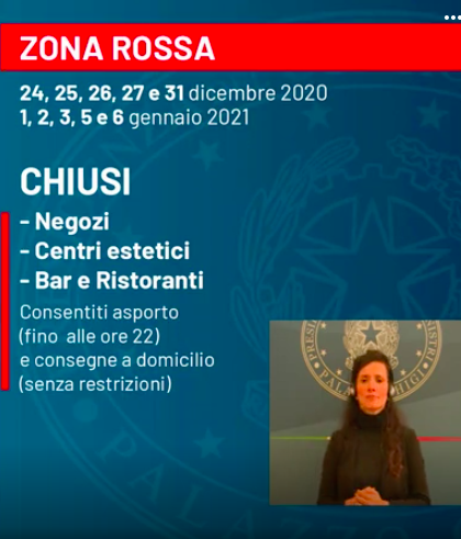 Per i primi (24, 24, 26, 27, 31 dicembre e 1, 2, 3, 5, 6 gennaio) entreranno in vigore le misure previste all’interno della zona rossa stabilita nel DPCM precedente, per i secondi (28, 29, 30 dicembre e 4 gennaio) invece saranno valide le misure della zona arancione, con alcune particolarità precisate di seguito.