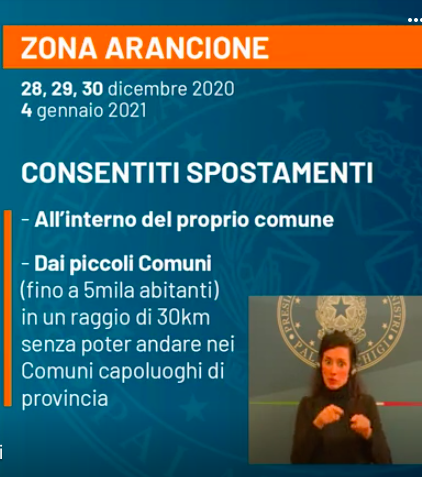 - nei giorni 28, 29, 30 dicembre 2020 e 4 gennaio 2021 si applicano le misure di cui all’articolo 2 del medesimo decreto del Presidente del Consiglio dei ministri 3 dicembre 2020 (cosiddette “Zone arancioni”), ma sono altresi’ consentiti gli spostamenti dai comuni con popolazione non superiore a 5.000 abitanti e per una distanza non superiore a 30 chilometri dai relativi confini, con esclusione in ogni caso degli spostamenti verso i capoluoghi di provincia.