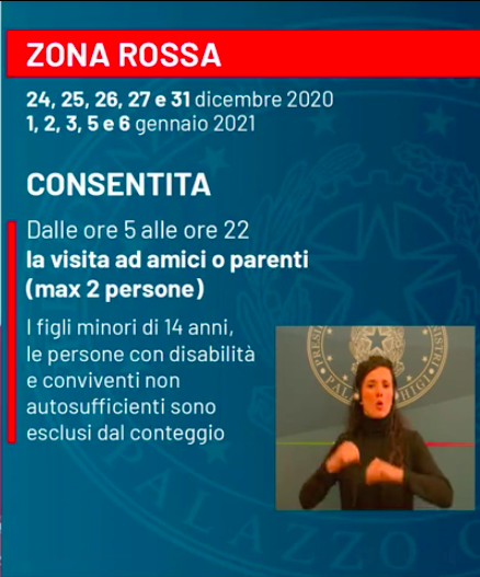 - Durante i giorni compresi tra il 24 dicembre 2020 e il 6 gennaio 2021 e’ altresi’ consentito lo spostamento verso una sola abitazione privata, ubicata nella medesima regione, una sola volta al giorno, in un arco temporale compreso fra le ore 05,00 e le ore 22,00, e nei limiti di due persone, ulteriori rispetto a quelle ivi gia’ conviventi, oltre ai minori di anni 14 sui quali tali persone esercitino la potesta’ genitoriale e alle persone disabili o non autosufficienti conviventi.