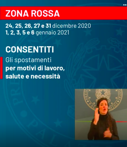 - Nei giorni festivi e prefestivi compresi tra il 24 dicembre 2020 e il 6 gennaio 2021 sull’intero territorio nazionale si applicano le misure di cui all’articolo 3 del decreto del Presidente del Consiglio dei ministri 3 dicembre 2020 (cosiddette “Zone Rosse”);