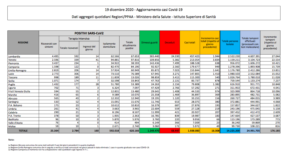 Coronavirus, Italia: il bollettino di sabato 19 dicembre