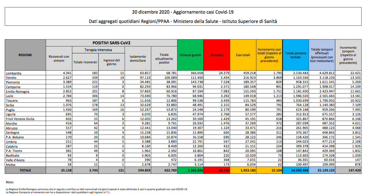 Coronavirus, Italia: il bollettino di domenica 20 dicembre