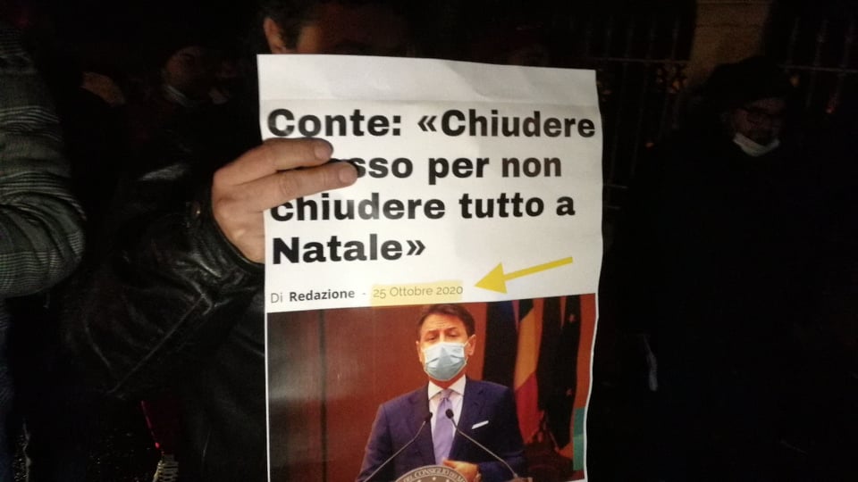 “È un piccolo gesto, siamo venuti qua a manifestare. Abbiamo chiuso tutto quando ci hanno detto di stare chiusi, ci hanno detto che lo facevano per farci passare un Natale aperto. Tantissimi nostri colleghi hanno riempito i frighi, abbiamo ordinato viveri. Una settimana prima ci dicono che non si fa niente, ci vedremo dal 6 di gennaio in poi. Dipendenti a casa, noi che non sappiamo se lavorare, la merce vedremo cosa farne, noi nel nostro locale abbiamo diminuito le persone per via dei distanziamenti”.