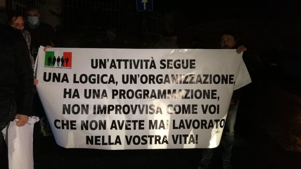 I manifestanti, molti di quali commercianti, hanno esibito striscioni di protesta e testimoniato ai cronisti presenti le proprie difficoltà economiche per via delle restrizioni imposte dalle norme anti-covid.