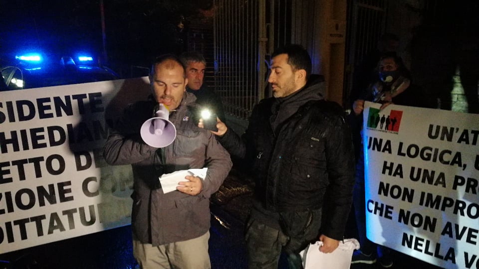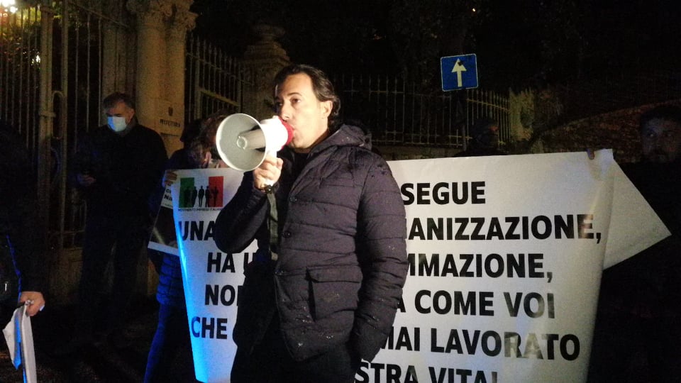 Tutto il nostro direttivo si autodenuncia. Noi rivendichiamo il diritto alla libertà e il diritto al lavoro. Noi non vogliamo disobbedire, noi chiediamo che vengano rispettati i diritti espressi dalla costituzione italiana. La Costituzione italiana è fondata sul lavoro, chiediamo di poter lavorare, chiediamo che le nostre aziende possano lavorare. Perchè un’azienda non può subire quello che sta subendo adesso. Apri, chiudi, apri di nuovo, chiudi un’altra volta. Come può un’azienda stare in piedi? Com’è possibile che siamo l’unico stato in Europa a cui non è permesso alle famiglie di riunirsi per Natale? Tutte le restrizioni che abbiamo visto in Europa non hanno comunque portato a passare il Natale lontani dalle famiglie. Adesso lo vediamo tutti cosa sta succedendo, abbiamo la variante. Abbiamo una novità che arriva dall’Inghilterra. E allora cosa dovremmo fare? Ricomincia per l’ennesima volta questa manfrina a cui siamo sottoposti? Che ci porterà nell’anno nuovo a fare un vaccino?