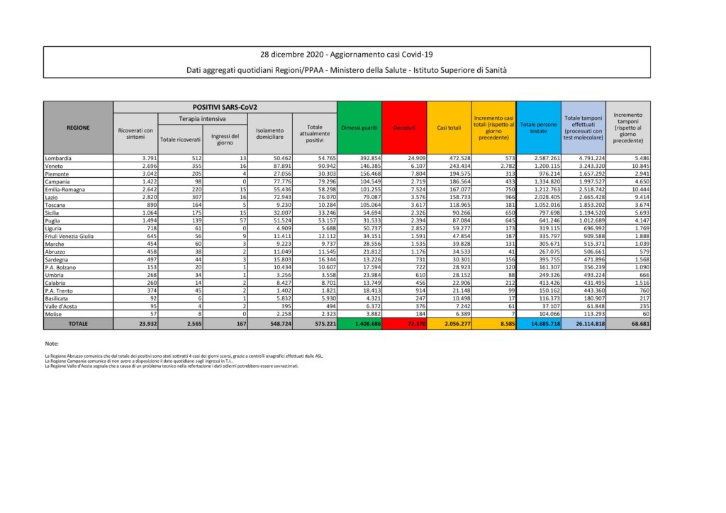 Coronavirus, Italia: il bollettino di lunedì 28 dicembre
