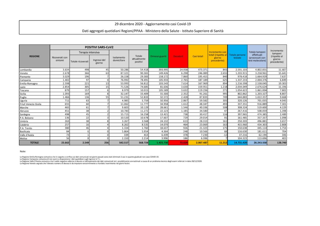 Coronavirus, Italia: il bollettino di martedì 29 dicembre