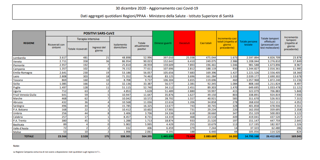 Coronavirus, Italia: il bollettino di mercoledì 30 dicembre