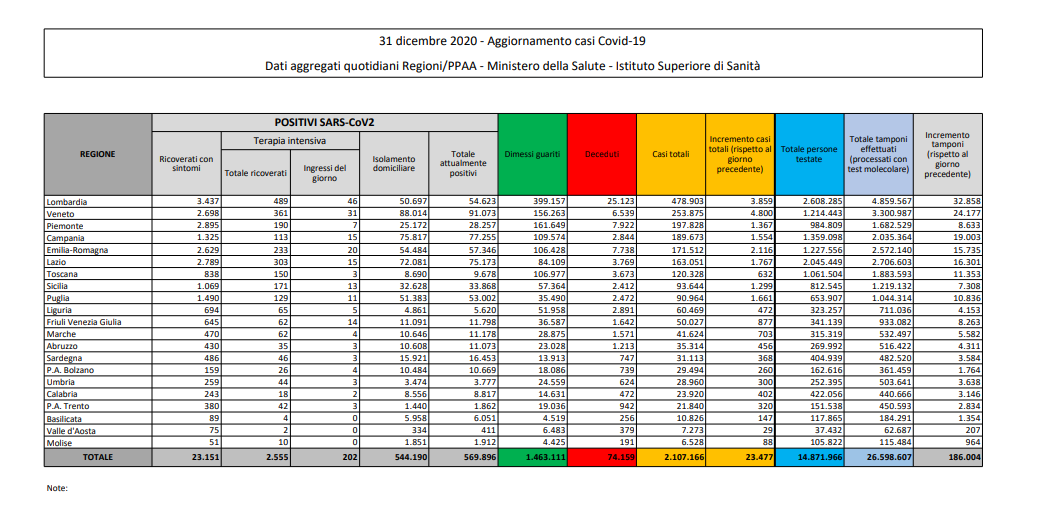 Coronavirus, Italia: il bollettino di giovedì 31 dicembre